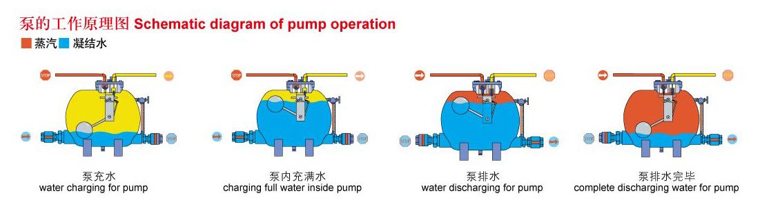 Automatic pump only has entrance side,and no"Vacuum"side.The key issue is that we shoule be conscious of the fact that such automatic pump in this kind could not pump and suck fluid inside.Medium should flow into the pump in virtue of gravity.The more pressure or hesd is,more bigger the CV value of check valve is,secondly,more bigger the CV value of exhaust valve is,the more faster the pace of completion of side circulation will be.Upon completion of liquid charging,control system will shun down exhaust valve and open intake valve.At the moment,steam and compressed gas will expel the liquid from pump.There are some factors influencing velocity of cicle discharging of liquid,including driving the pressure of steam or air,CV value of check valve of exit back valve,downstream back pressure,along with possibility of flowing medium and temperature of surroundings(In case of taking steam as driving air),The last factor is often ignored,but the fact is that steam will be condensed,therefore,reduce actual driving pressure,such phenomenon could be very serious on some applications.