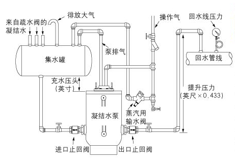 冷凝水從一個(gè)有壓系統(tǒng)排入另一較高壓力的系統(tǒng)。凝結(jié)水自動(dòng)泵的進(jìn)口管和回液管可能都是抬高的。這種安裝方法用一個(gè)帶壓集水罐也可用于高疏液量工藝裝置。